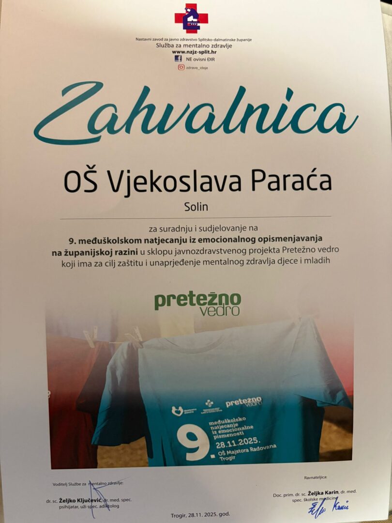 U organizaciji Nastavnog zavoda za javno zdravstvo Splitsko-dalmatinske županije, učenici šestih razreda naše škole sudjelovali su na međuškolskom natjecanju iz emocionalne pismenosti održanom 29. studenoga 2025. u OŠ Majstora Radovana u Trogiru. Na natjecanju je sudjelovalo sedam učenika i učenica 6. a, b i c razreda.